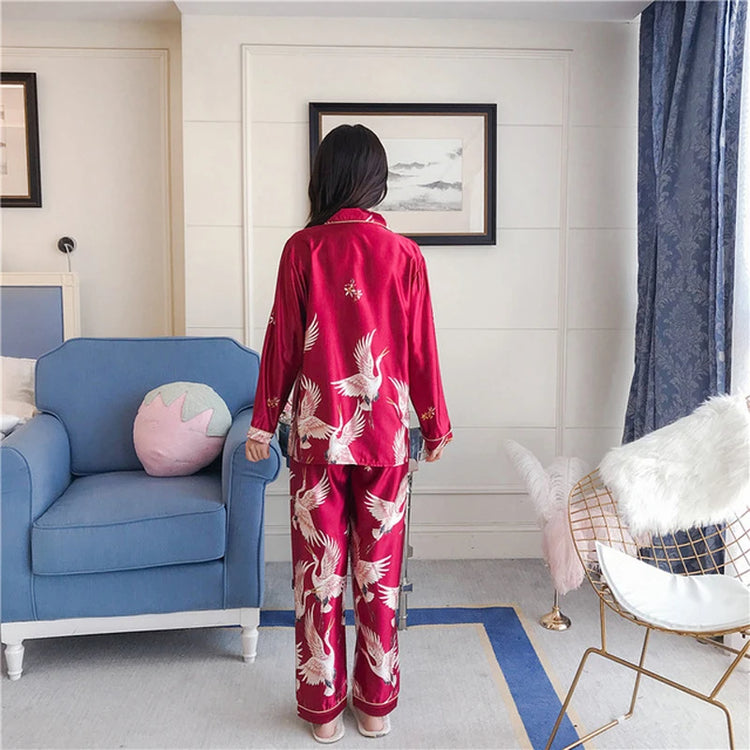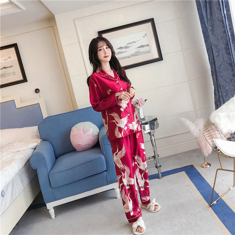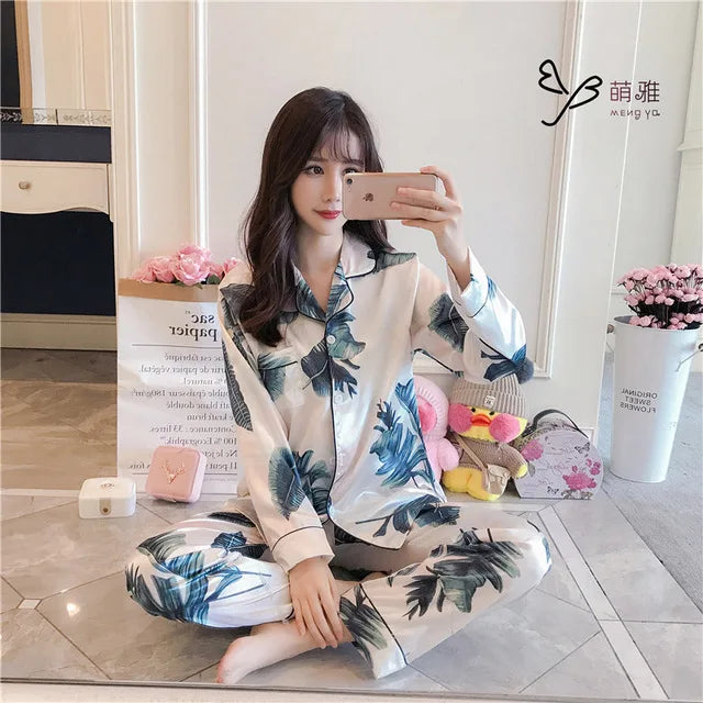 2PCS Pajamas Sets Womens Long Sleeve Long Pants Sleepwear Silky Satin Home Wear Nightgown Oversize 5XL Autumn New Sleepshirts