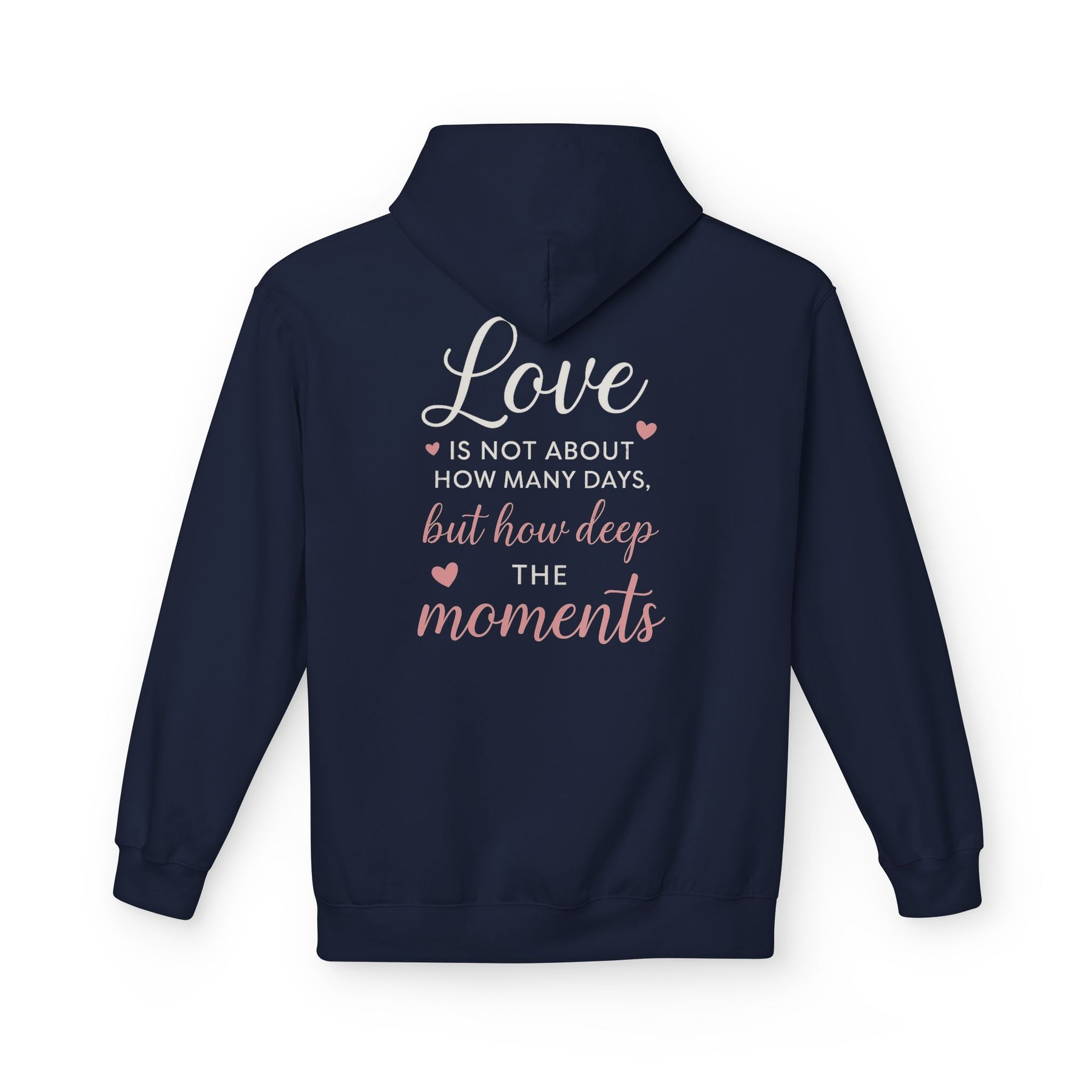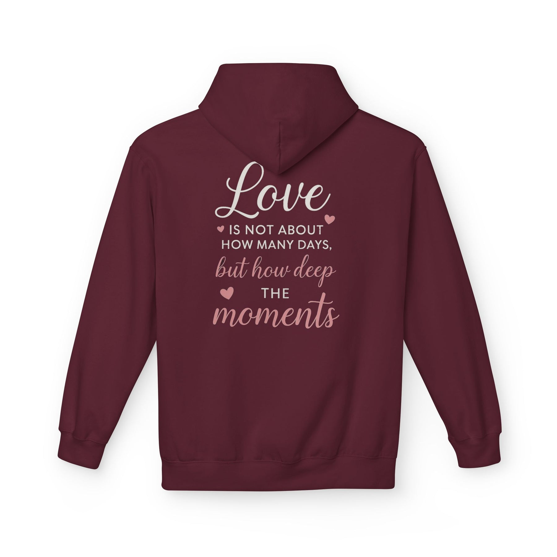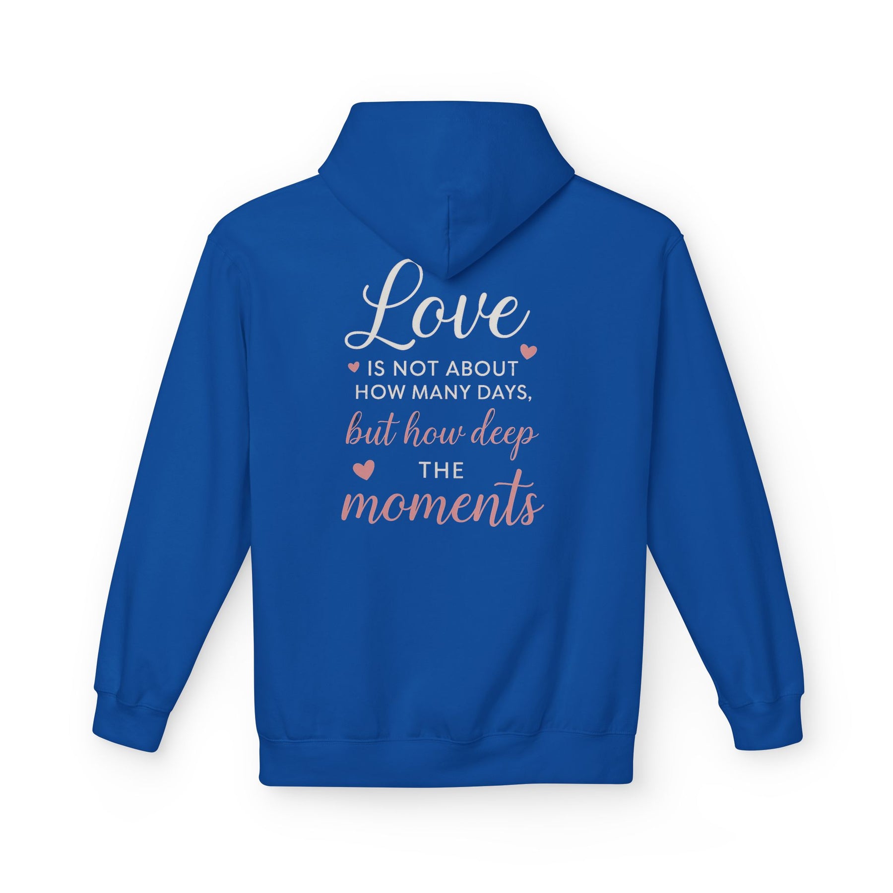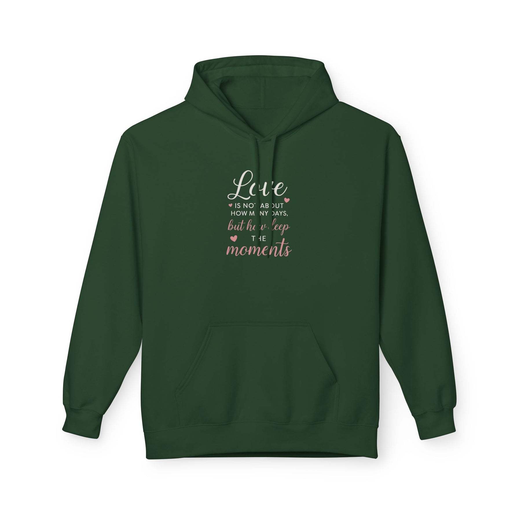 Embrace warmth and style with this cozy fleece hoodie, perfect for those who appreciate comfort and meaningful connections. The uplifting phrase on the hoodie inspires love and cherishing every moment. Ideal for casual outings, stay-at-home days, or gatherings with loved ones, this hoodie adds a heartwarming touch to any outfit. Its medium-heavy fabric and relaxed fit make it suitable for both lounging and adventure, offering a versatile addition to your wardrobe. Perfect for gifting on holidays like Valentine’s Day, anniversaries, or any occasion celebrating love and togetherness. Show someone special how much they mean to you with this heartfelt hoodie.
